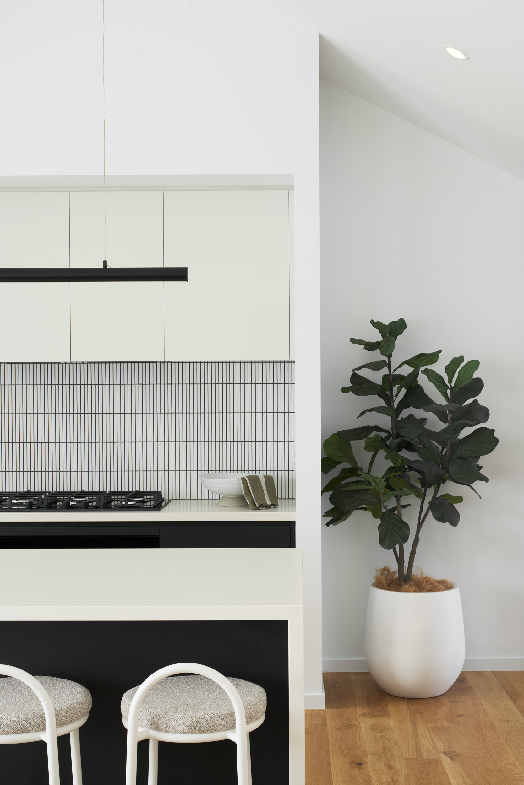 The façade’s clean architectural lines are carried through to the interiors, where tactile textures, warm timber, and hints of nature soften a monochrome base. “We’ve balanced a contemporary, minimal foundation with materials that feel grounded and homely,” says Boutique Homes Project Designer Kat Moore. “It’s a home of energy and connection, visually, socially, and functionally.”