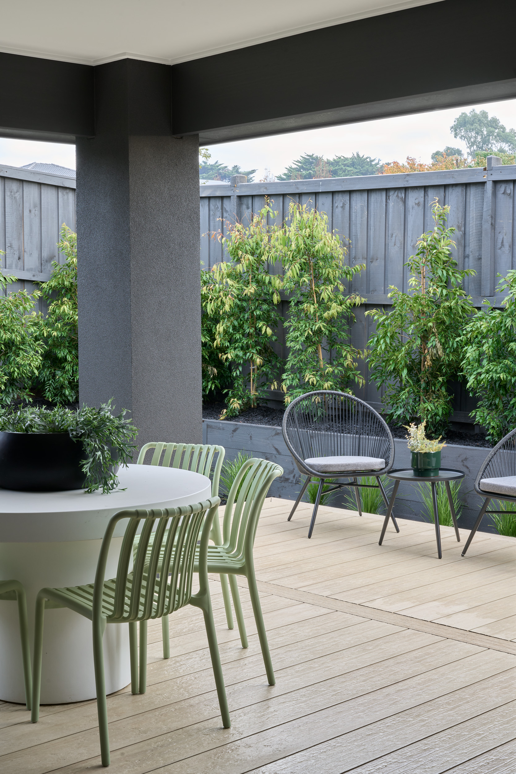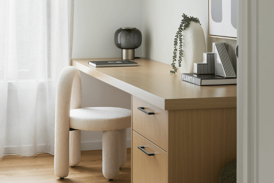 The façade’s clean architectural lines are carried through to the interiors, where tactile textures, warm timber, and hints of nature soften a monochrome base. “We’ve balanced a contemporary, minimal foundation with materials that feel grounded and homely,” says Boutique Homes Project Designer Kat Moore. “It’s a home of energy and connection, visually, socially, and functionally.”